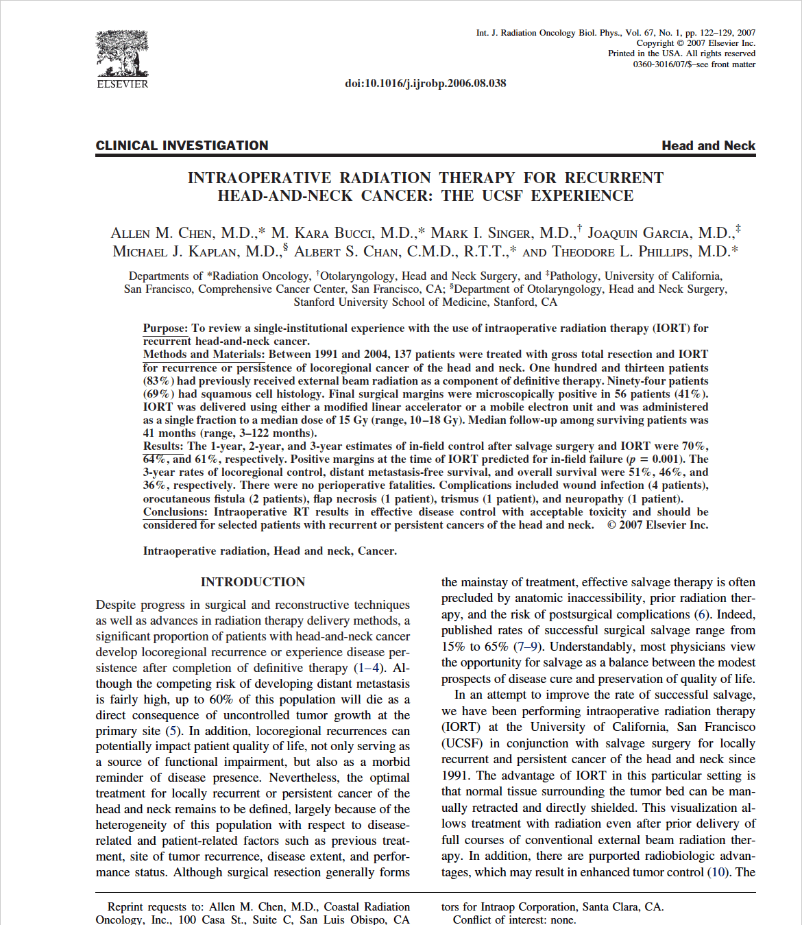 Intraoperative RT results in effective disease control with acceptable toxicity and should be considered for selected patients with recurrent or persistent cancers of the head and neck. © 2007 Elsevier Inc.
