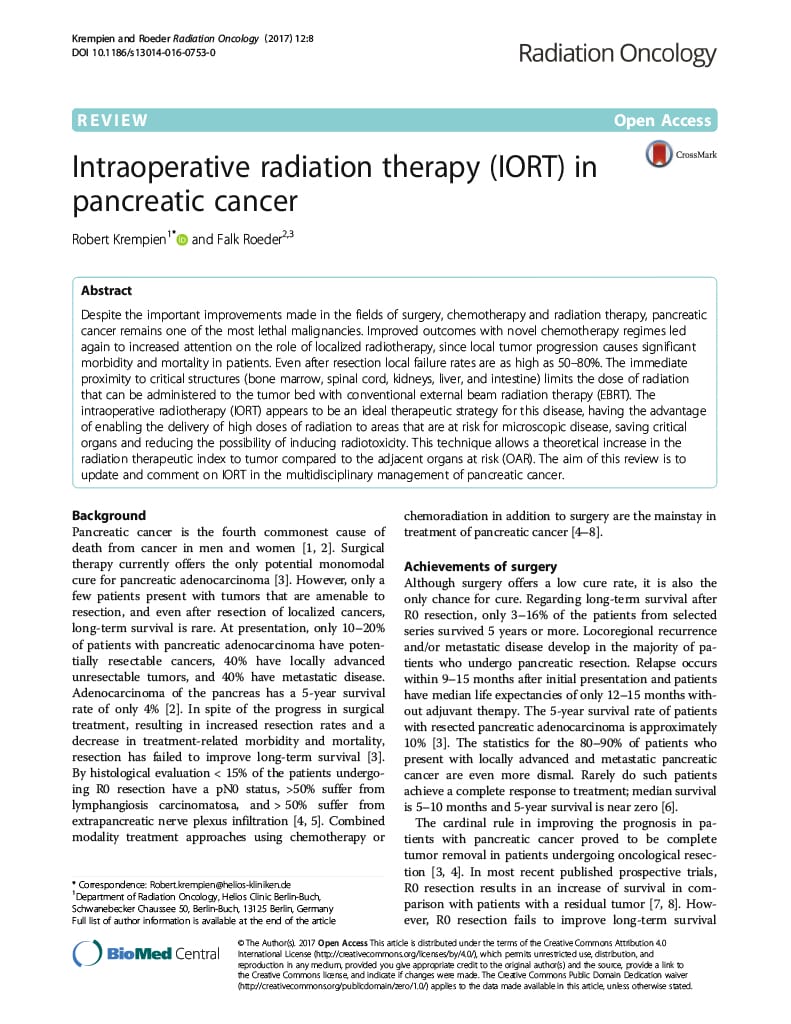 Despite the important improvements made in the fields of surgery, chemotherapy and radiation therapy, pancreatic cancer remains one of the most lethal malignancies. Improved outcomes with novel chemotherapy regimes led again to increased attention on the role of localized radiotherapy, since local tumor progression causes significant morbidity and mortality in patients. Even after resection local failure rates are as high as 50–80%. The immediate proximity to critical structures (bone marrow, spinal cord, kidneys, liver, and intestine) limits the dose of radiation that can be administered to the tumor bed with conventional external beam radiation therapy (EBRT). The intraoperative radiotherapy (IORT) appears to be an ideal therapeutic strategy for this disease, having the advantage of enabling the delivery of high doses of radiation to areas that are at risk for microscopic disease, saving critical organs and reducing the possibility of inducing radiotoxicity. This technique allows a theoretical increase in the radiation therapeutic index to tumor compared to the adjacent organs at risk (OAR). The aim of this review is to update and comment on IORT in the multidisciplinary management of pancreatic cancer.