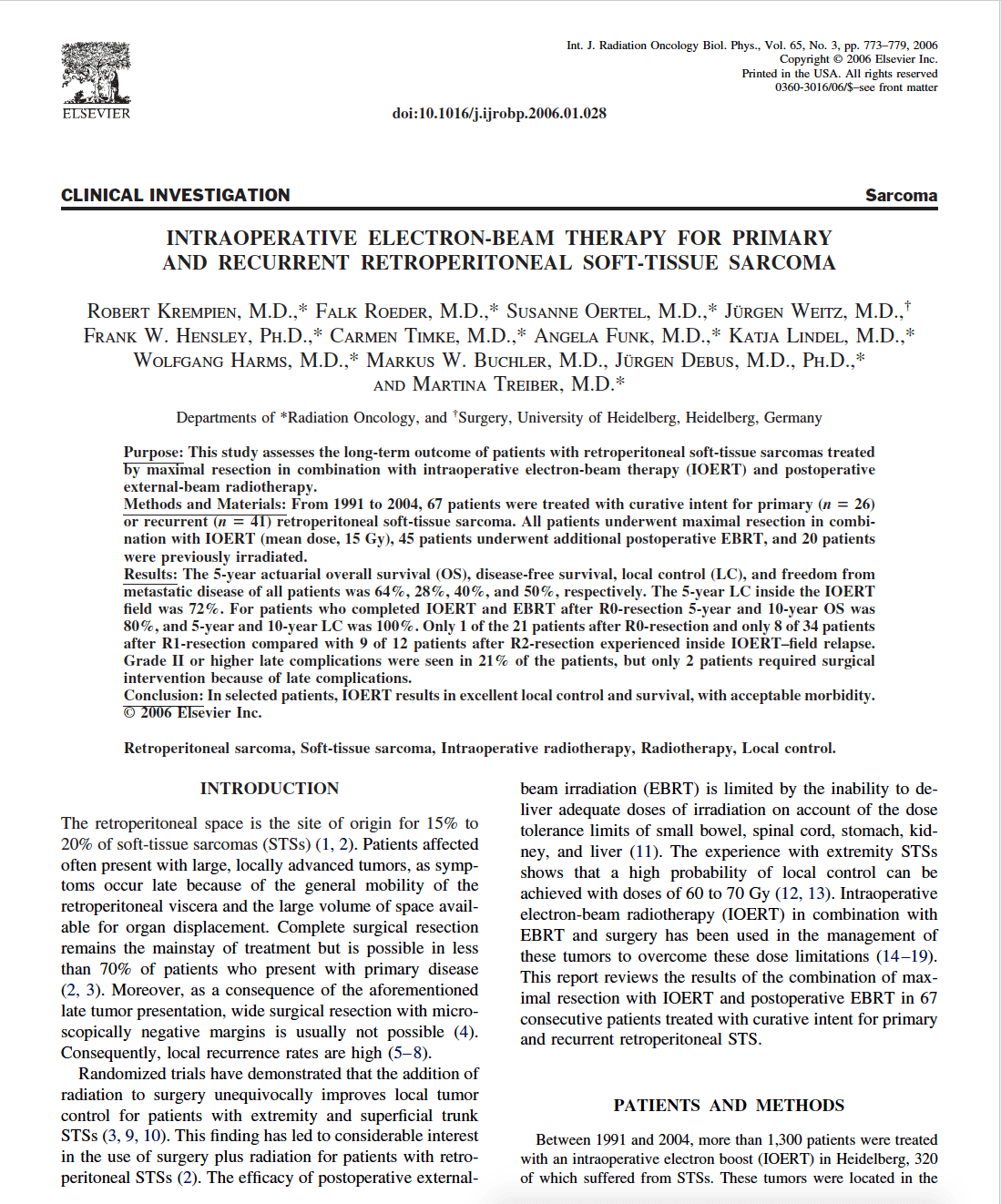 In selected patients, IOERT results in excellent local control and survival, with acceptable morbidity. © 2006 Elsevier Inc.