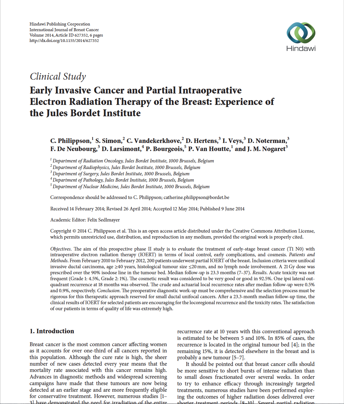 The preoperative diagnostic work-up must be comprehensive and the selection process must be rigorous for this therapeutic approach reserved for small ductal unifocal cancers. After a 23.3-month median follow-up time, the clinical results of IOERT for selected patients are encouraging for the locoregional recurrence and the toxicity rates. The satisfaction of our patients in terms of quality of life was extremely high.
