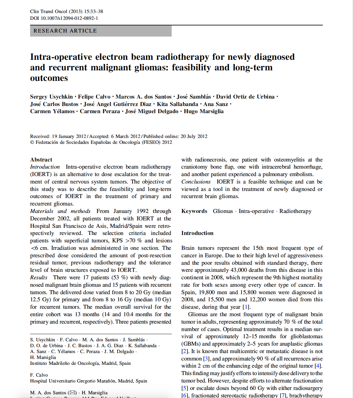 From January 1992 through December 2002, all patients treated with IOERT at the Hospital San Francisco de Asis, Madrid/Spain were retrospectively reviewed. The selection criteria included patients with superficial tumors, KPS >70% and lesions <6 cm. Irradiation was administered in one section. The prescribed dose considered the amount of post-resection residual tumor, previous radiotherapy and the tolerance level of brain structures exposed to IOERT.