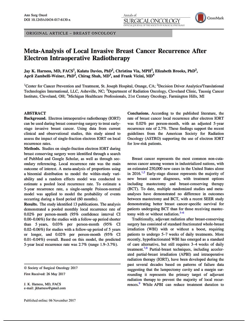 The American Society of Radiation Oncology (ASTRO) issued an updated Consensus Statement on Accelerated Partial Breast Irradiation (APBI) in the journal Practical Radiation Oncology confirming the use of electron-beam IORT as an effective modality for the treatment of suitable patients with invasive breast cancer.